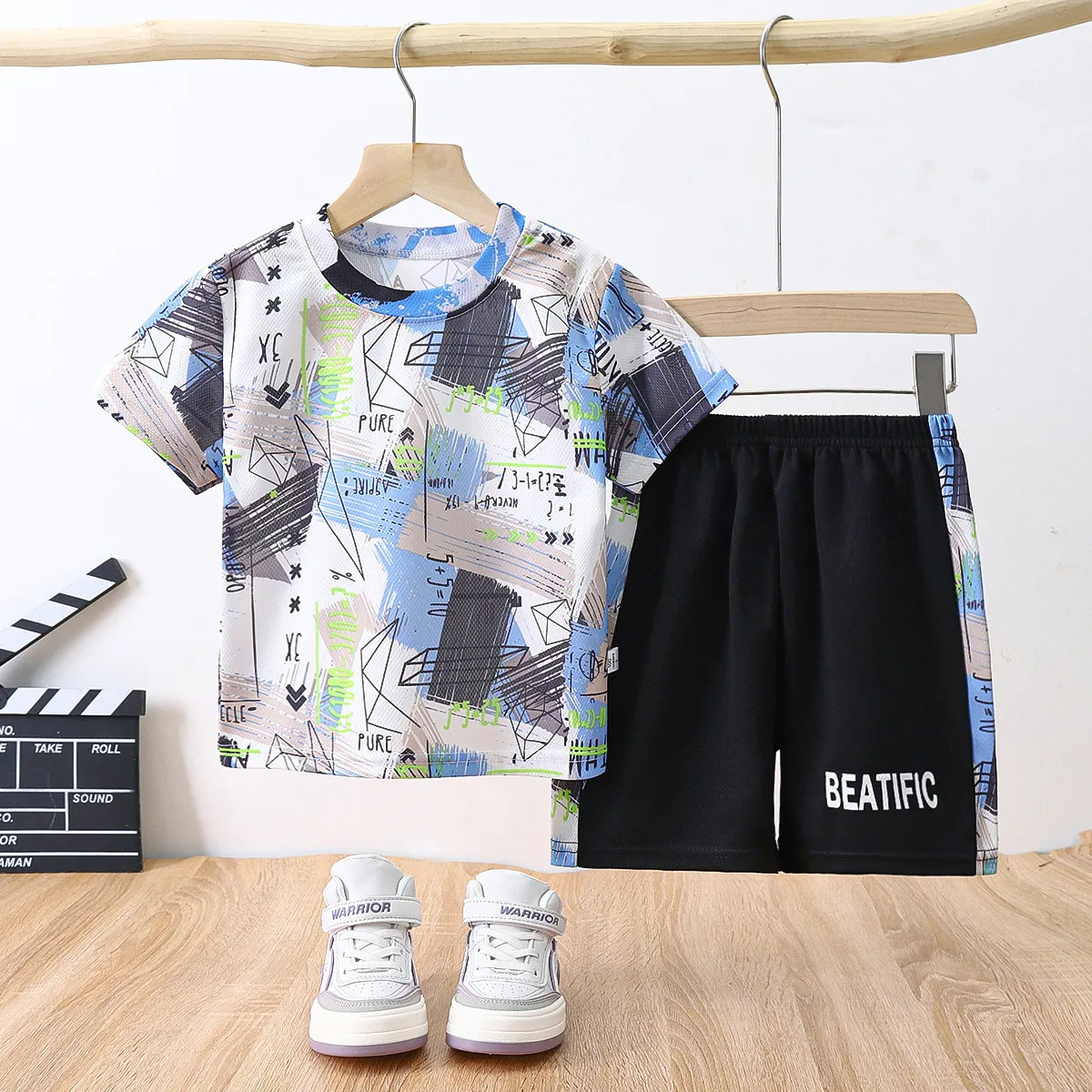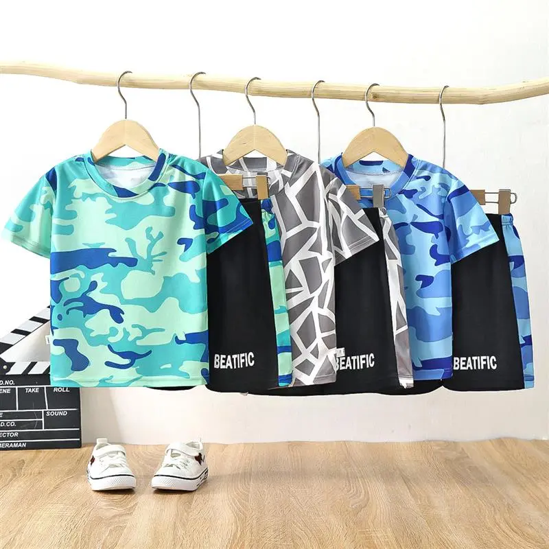 Wholesale طقم تي شيرت قصير الأكمام بطبعة أبجدية مموهة للأطفال الصغار والأولاد الكبار