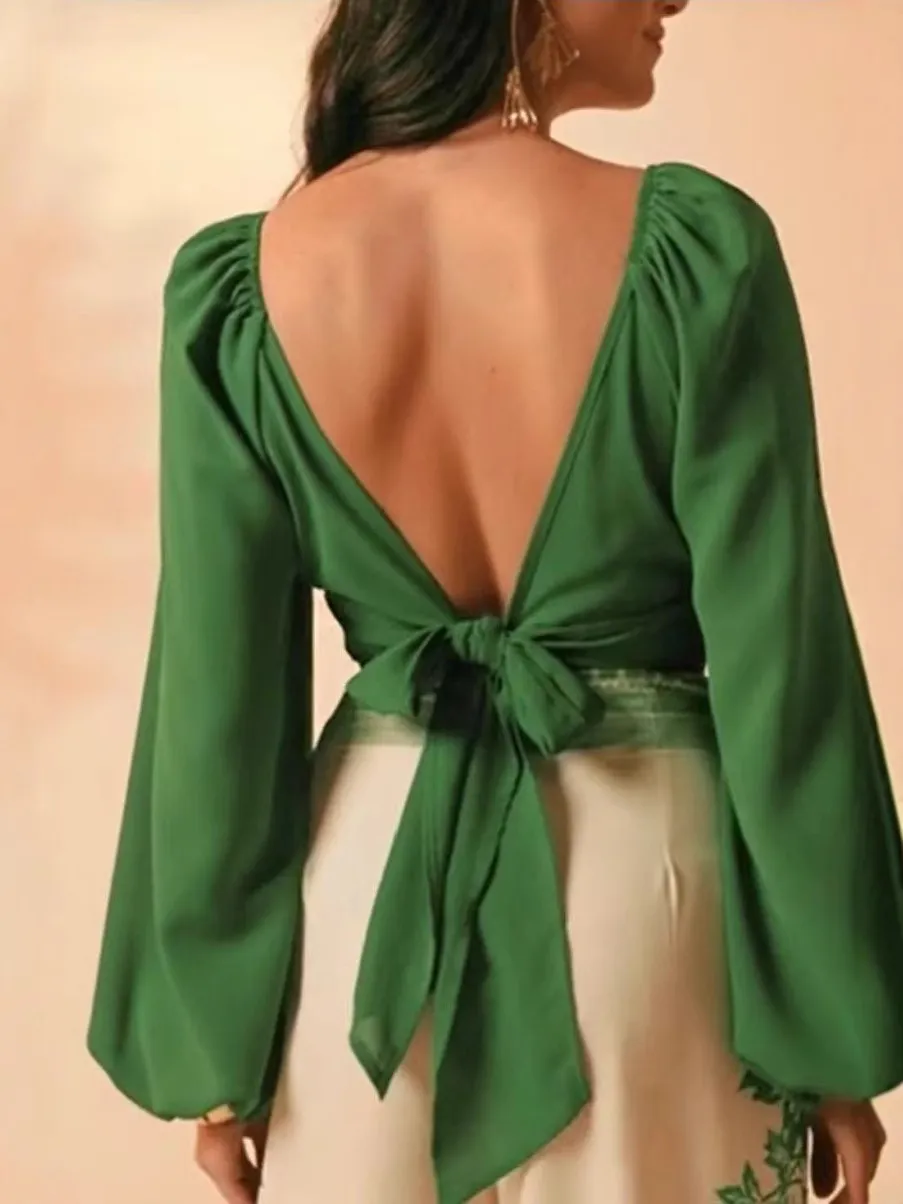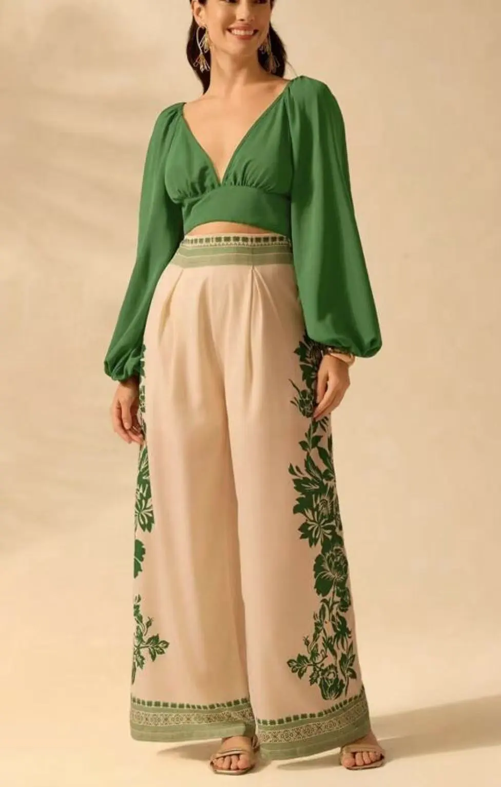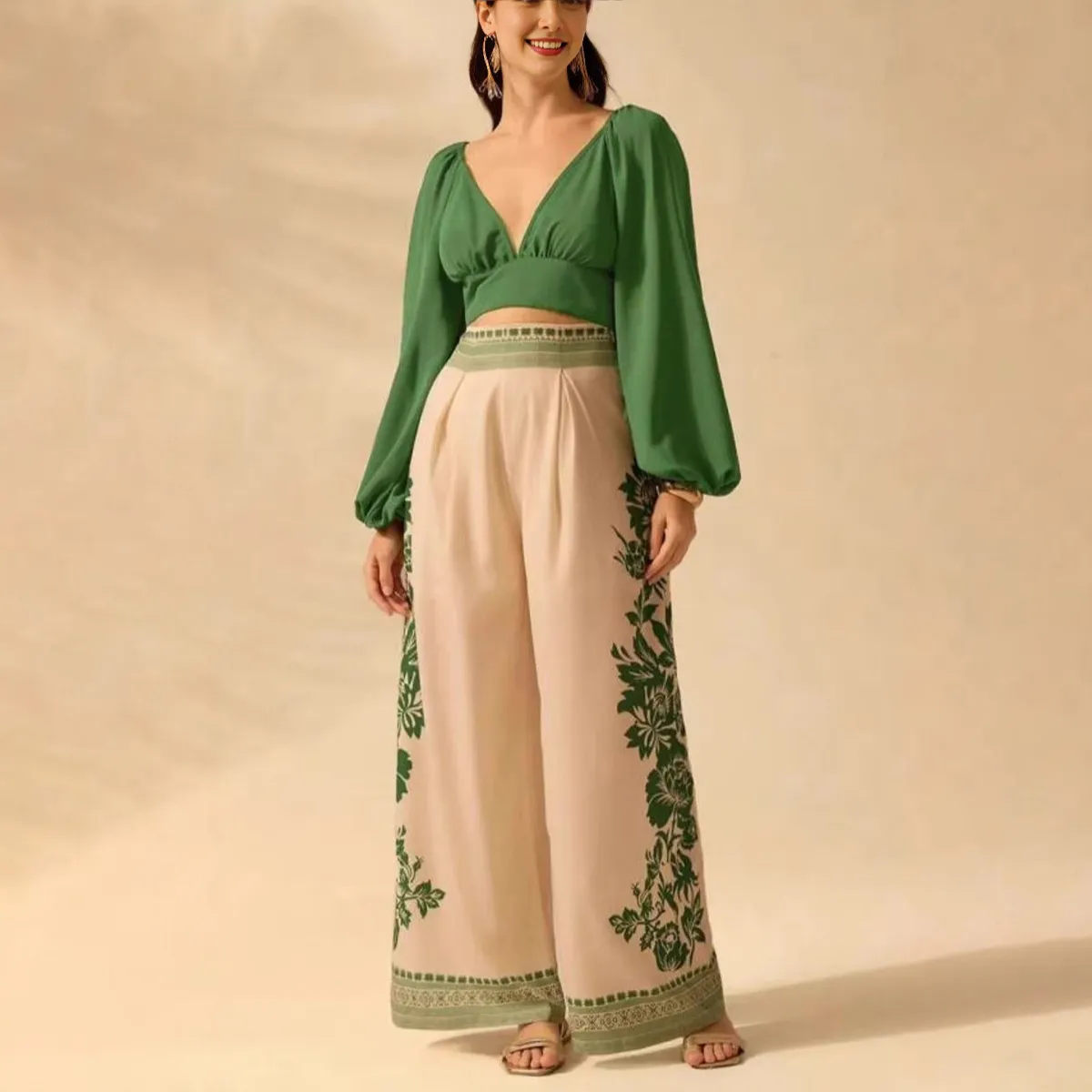Wholesale طقم مكون من قطعتين من بلوزة مكشوفة الظهر بأكمام طويلة ورقبة على شكل حرف V وبنطلون واسع الساق وفضفاض للنساء