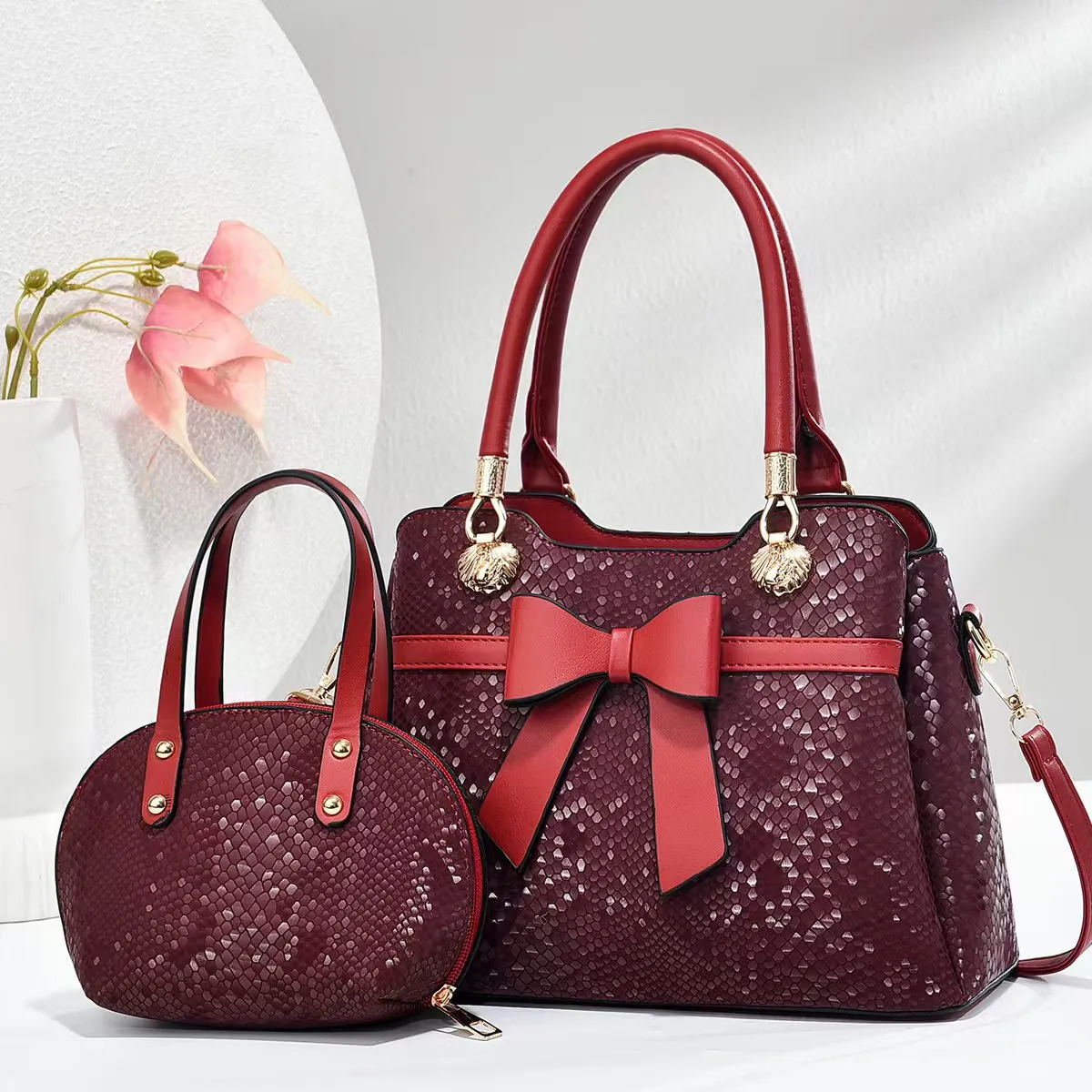 Wholesale حقيبة يد نسائية أنيقة بلون سادة مزينة بعقدة وسعة كبيرة، مجموعة من قطعتين