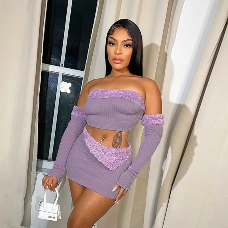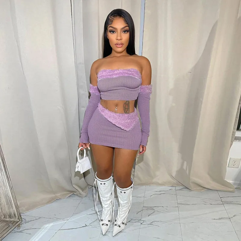 Wholesale Conjunto de falda top corto con costura de felpa sexy a la moda para mujer