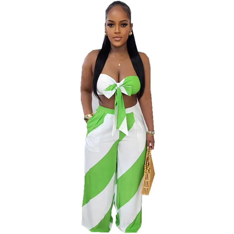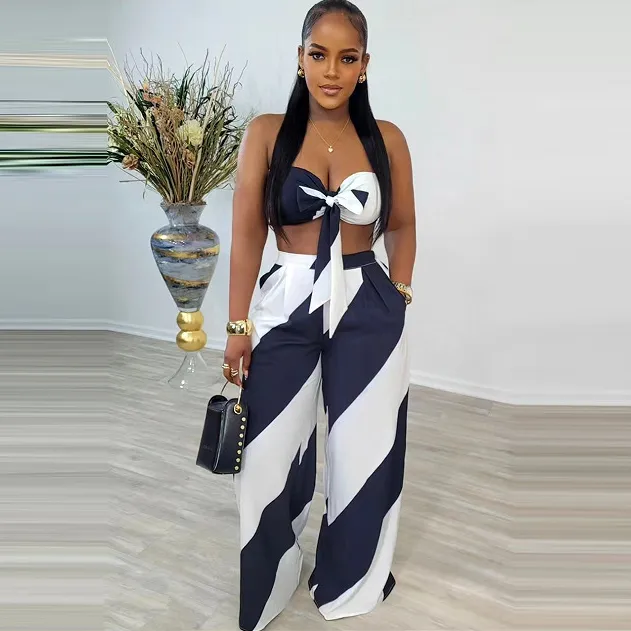 Wholesale Conjunto de dos piezas de pantalones de pierna ancha sin tirantes con estampado de rayas sexys a la moda de verano para mujer