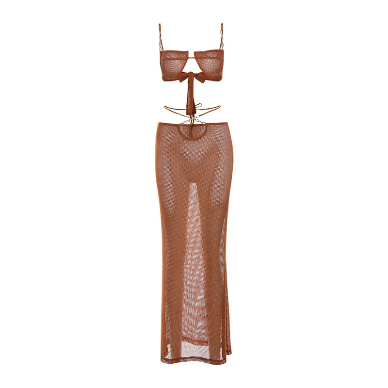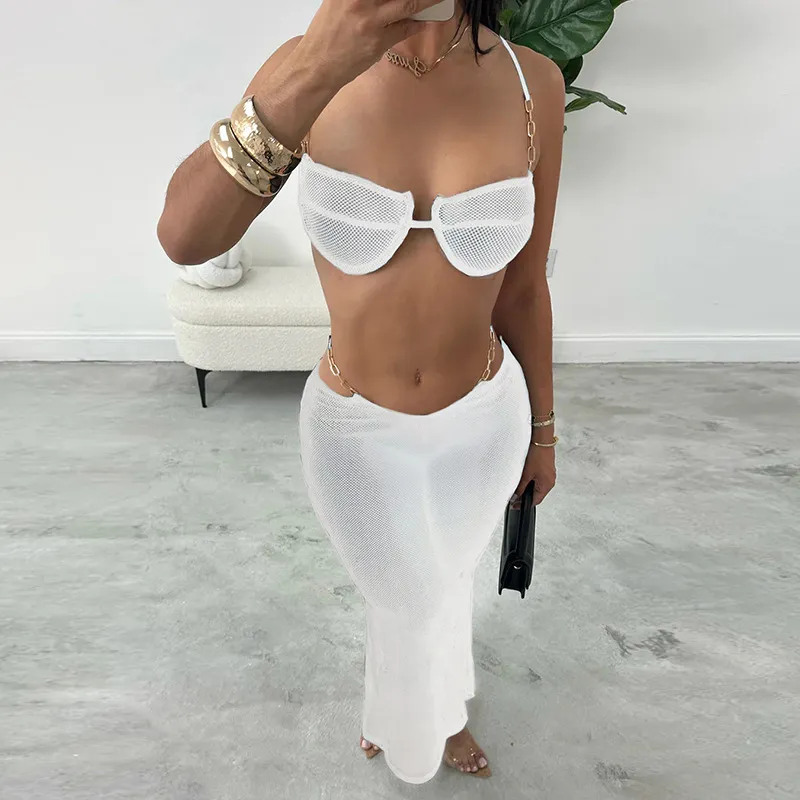 Wholesale Conjunto de dos piezas de falda y top con tiras de cadena de metal y perspectiva sexy para mujer de verano