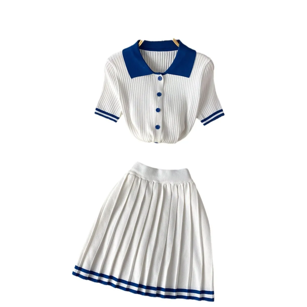 Wholesale Conjunto de dos piezas de falda plisada de cintura alta y top de punto de manga corta con cuello tipo polo a la moda para mujer