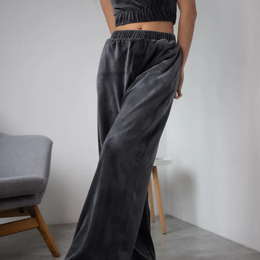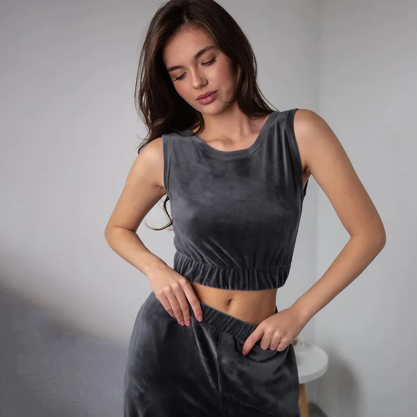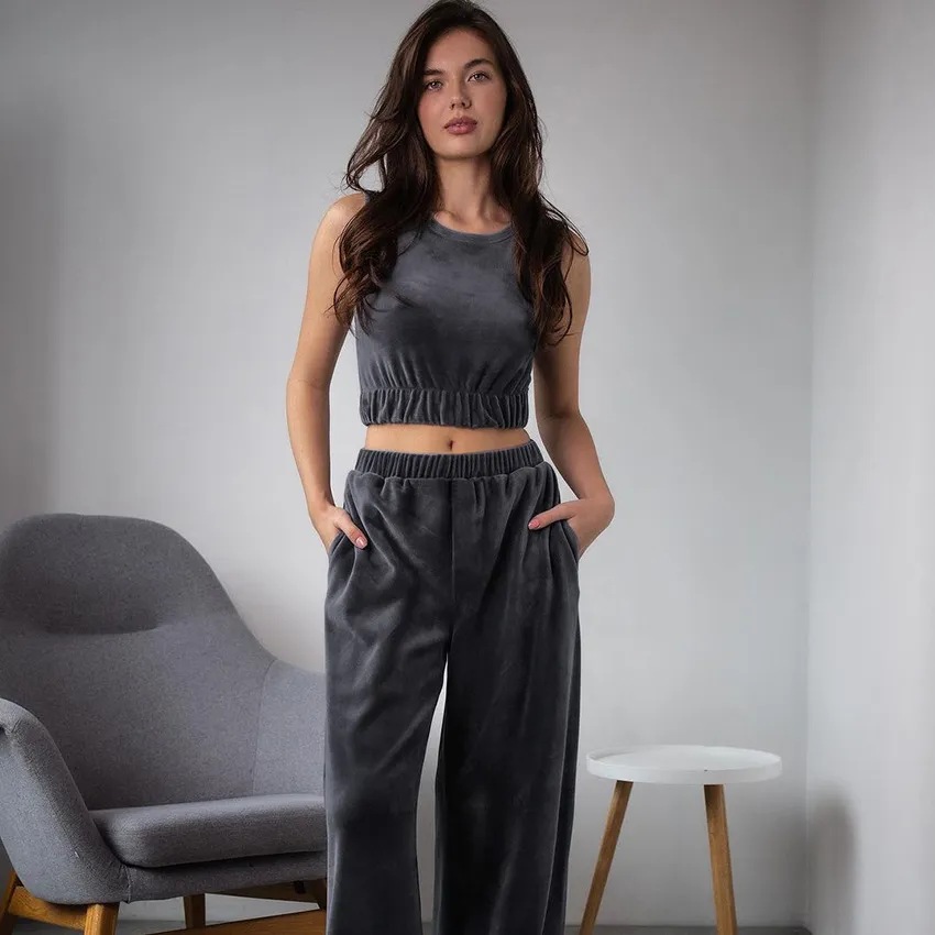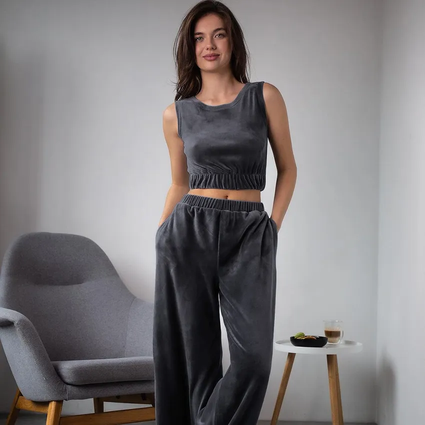 Wholesale Conjunto de pijama para el hogar con parte superior y pantalones de terciopelo sin mangas de color sólido a la moda para mujer