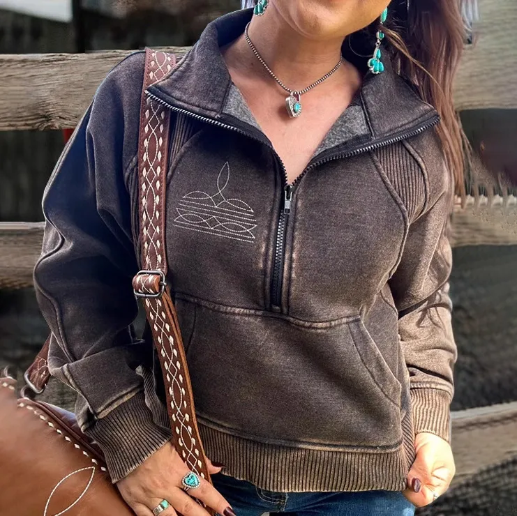 Wholesale Sudadera informal con solapa estampada y manga larga con cremallera y costuras para mujer