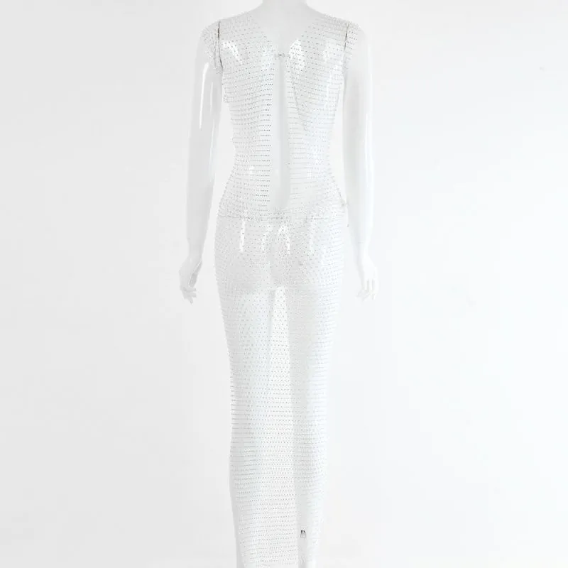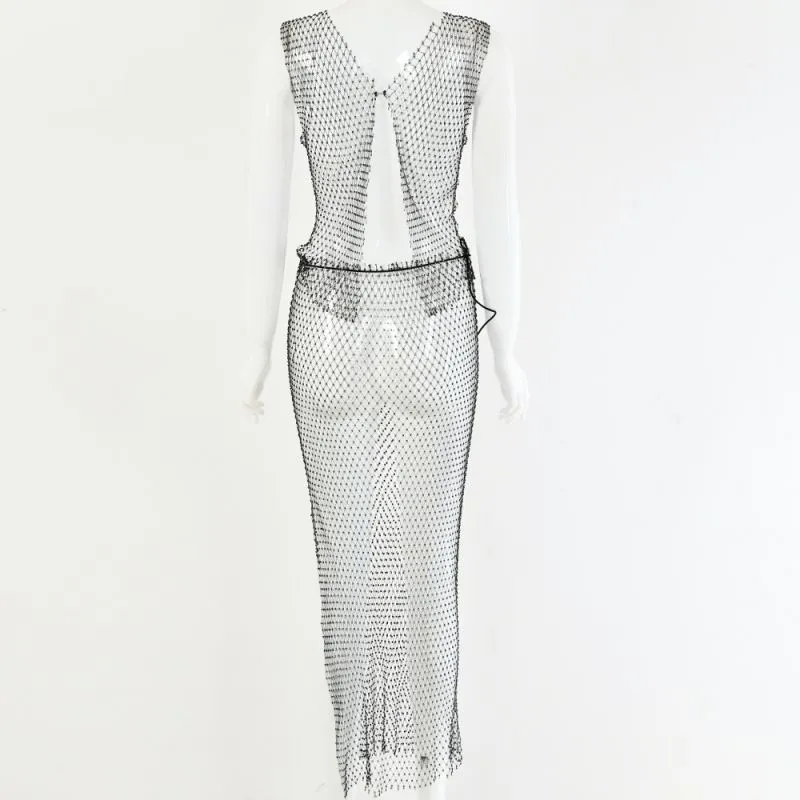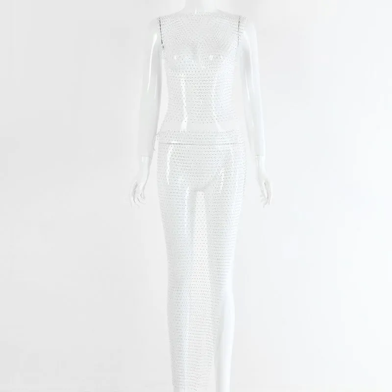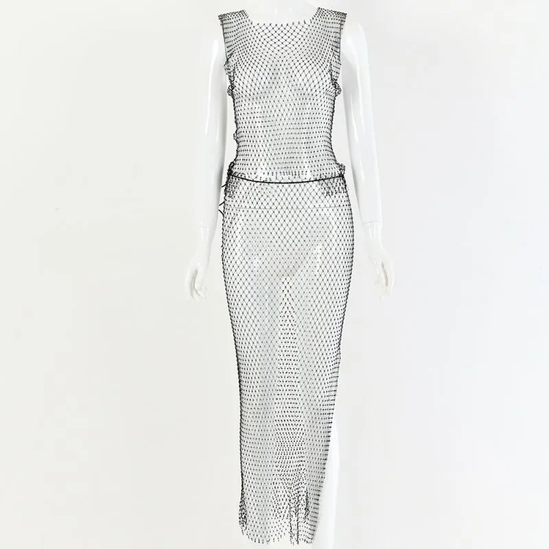 Wholesale Vente chaude femmes sexy sans manches maille creuse débardeur jupe fendue latérale transparent ensemble deux pièces