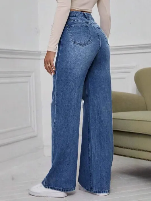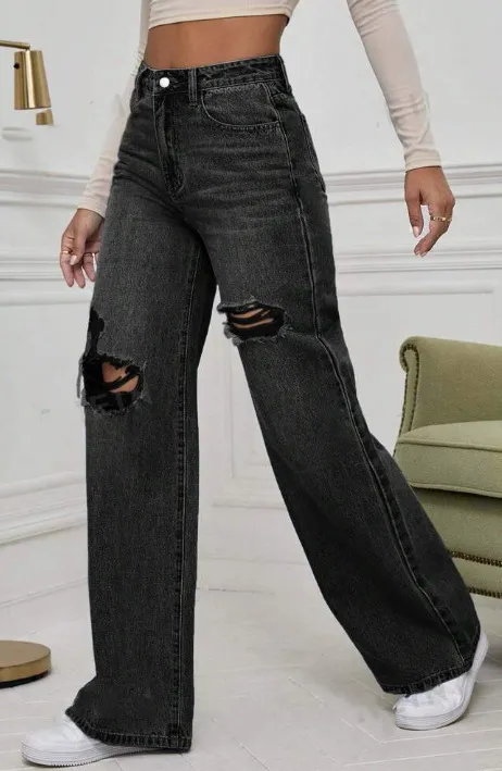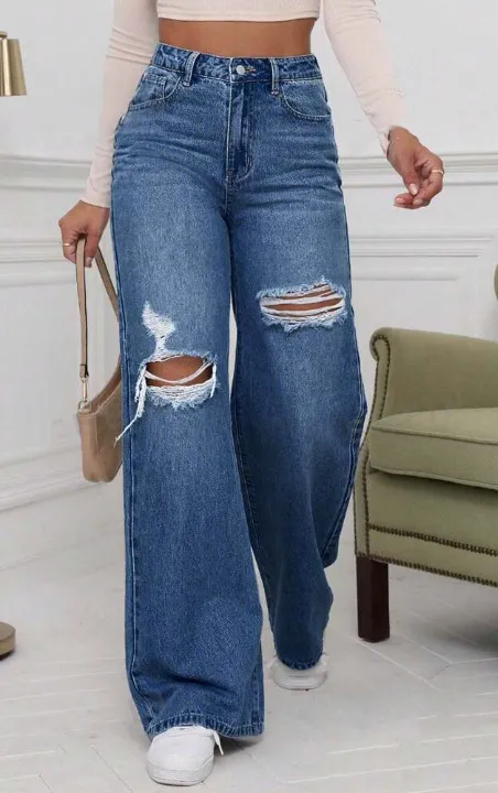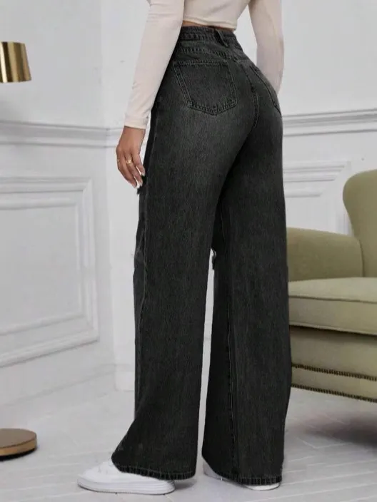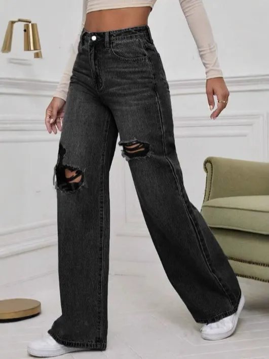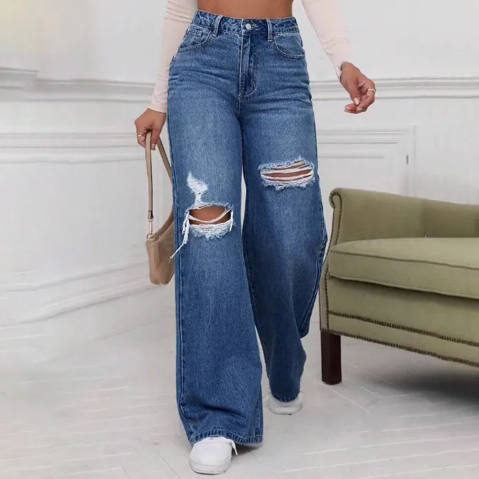Wholesale Jean droit large taille moyenne déchiré décontracté pour femme