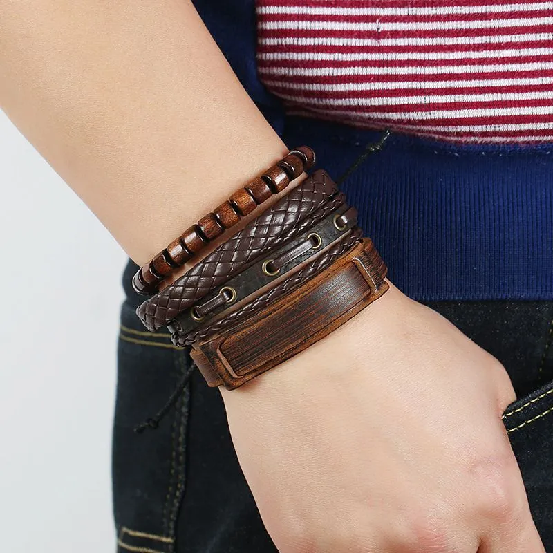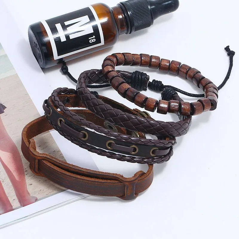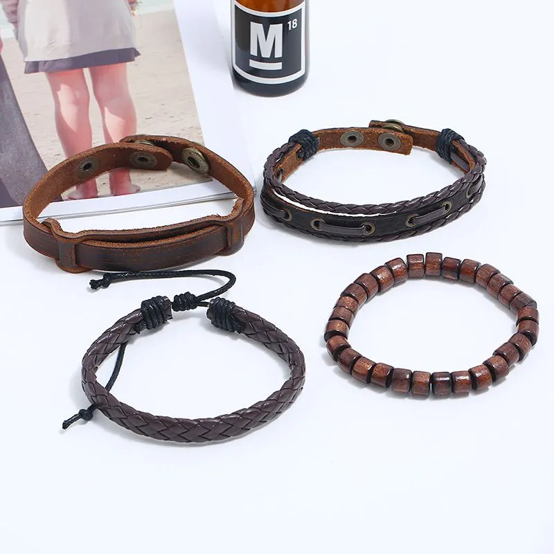 Wholesale Hot Sale Men 4pcs/set Leather Cord Braided Wooden Beads Bracelets