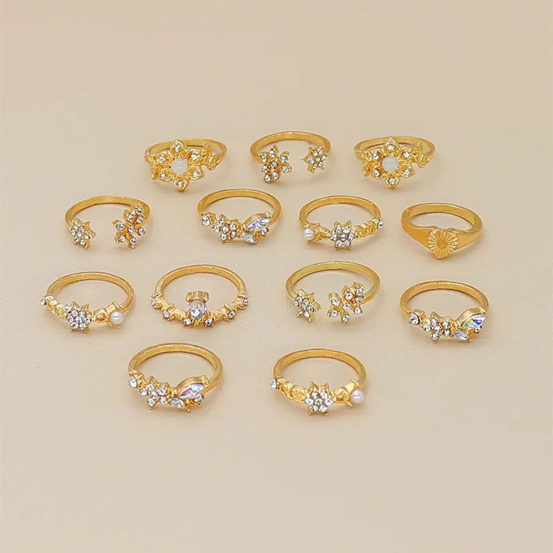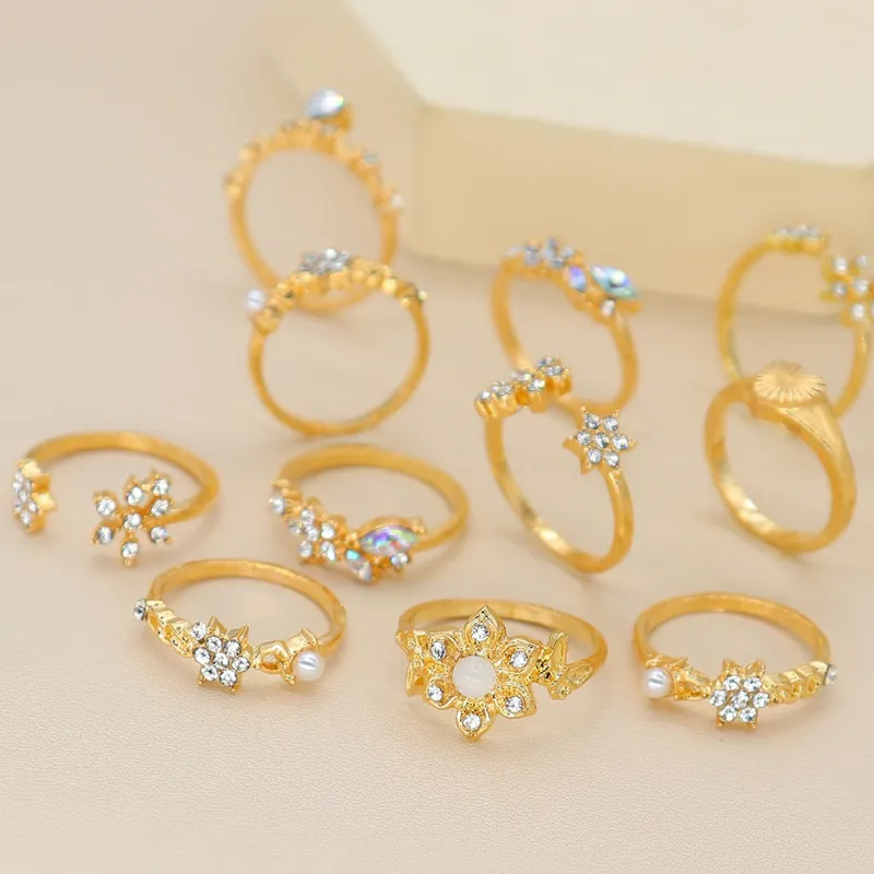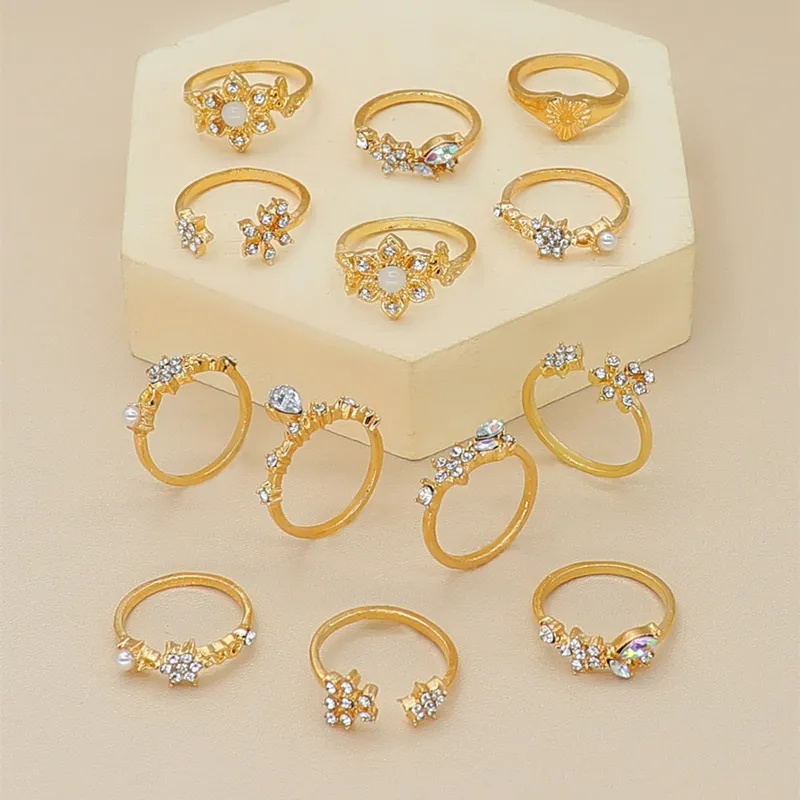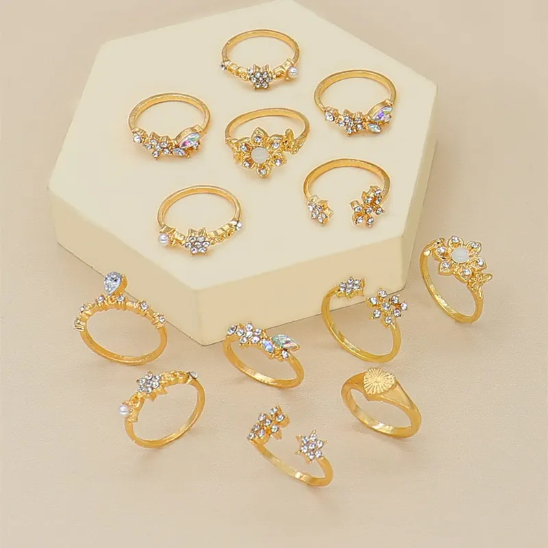 Wholesale Combination Fashion Pearl Rhinestone Floral Knuckle Ring 13 Piece Set Women